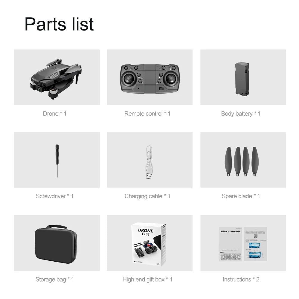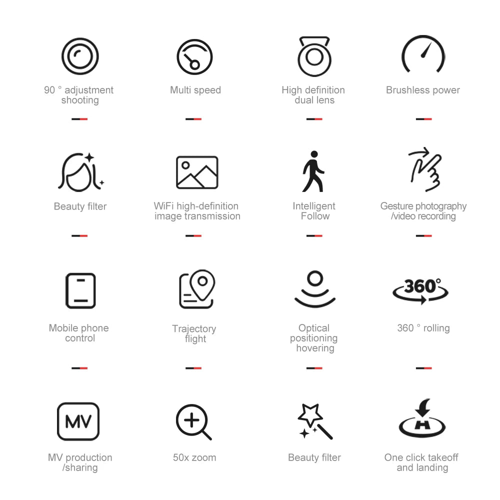 One-key takeoff/one-key landing/ascent/descent/left and right steering/forward/backward/left fly/right fly/smart follow/roll/headless mode/fast and slow gear/photo/video/optical flow positioning/dual cameras/face/gesture recognition automatic photo/gravity sensing/trajectory flight/
