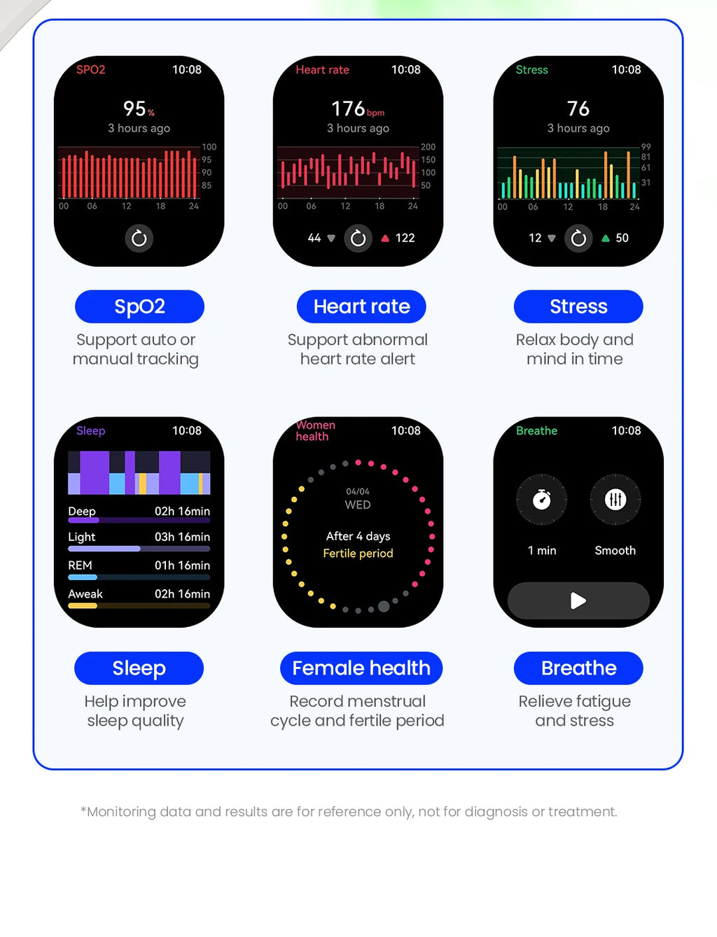 Sleep Monitoring / Heart Rate Monitoring / SpO2 Tracking / Female Menstrual Cycle / Stress Test / Sedentary Reminder / Water-intake Reminder / Medication Reminder / Hoart Rate Alort / Breathing Training / Motion Detection.
