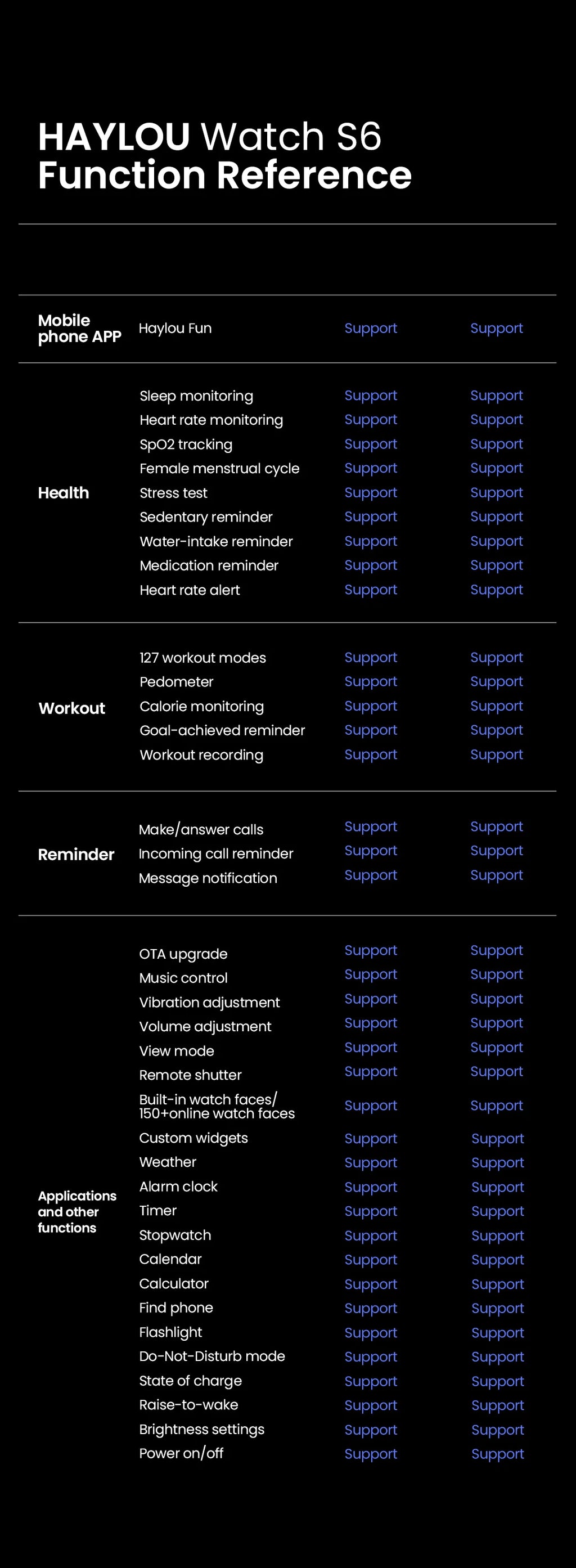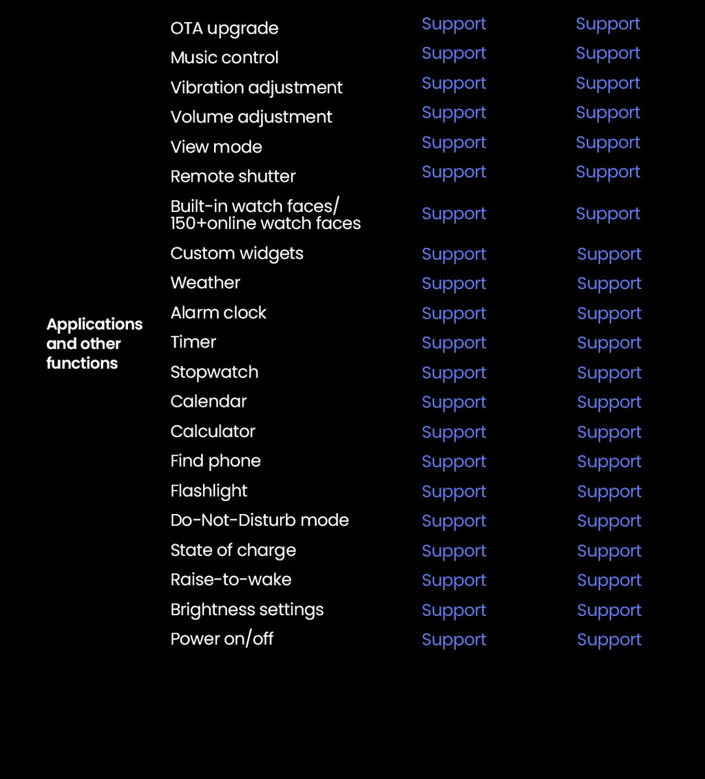 OTA upgrade / Music control / Vibration adjustment / Volume adjustment / View mode / Remote shutter / Built-in watch faces / 150+ online watch faces / Custom widgets / Weather / Alarm clock / Timer / Stopwatch / Calendar / Calculator / Find phone / Flashlight / Do-Not-Disturb mode / State of charge / Raise-to-wake / Brightness settings / Power on/off / Remote shutter.